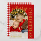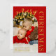 Red and gold Christmas card personalised with a photo and your family name in a gold foil script. Modern photo Christmas card in red with gold foil lettering.