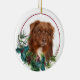 On the front of this Holiday ornament is a portrait of a beautiful red Australian Shepherd Dog peeking out of a holly and evergreen bough. Red berries and pine cones decorate the holly and pine sprigs. The image is placed on a white circle within a thin red line circle. The back of the ornament has the same evergreen bough wreath and circle with your custom text in red.