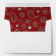 Stylish all purpose square invitation envelope done in white, with a red bandanna patterned lining and coloured stripe on the back flap. Return address in red, on the front, is ready to personalise. Great finishing touch to any western invitation with a red colour in it.
