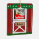 Red barn door custom Christmas ornament with photo window on both sides. Upload your photos to replace the sample photo. There is also a barn door sign on both sides with text that can be personalised.