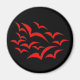 This magnet features a collection of simple images of bats flying together in a cloud pattern. The bats are red and the background is black. Kids are sure to love this cute design.
