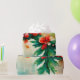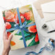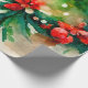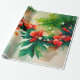 Christmas wrapping paper depicts an elegant floral watercolor design with bold red berries and greenery.