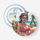 Cute beachy pop art summer themed can opener. A cute comic book style cartoon illustration of a woman in a red polka dot bikini, bandanna and sunglasses.