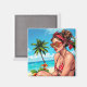 Cute beachy pop art summer themed magnet. A cute comic book style cartoon illustration of a woman in a red polka dot bikini, bandanna and sunglasses.