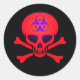 Black sticker with a biohazard symbol skull and crossbones design in red and purple.