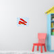 This unique and simple design features a flying biplane. The plane is comprised of solid colours which gives it a very graphic look. A large star bust appears behind the old aeroplane which frames the pattern. The simple graphics gives the illustration the look of old toy or model packaging giving it a nostalgic, vintage feel.