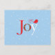 A holiday postcard with a whimsical original design by Mango Moon Studio, brings the spirit of the holidays to life, showcasing a delightful red bird perched atop the word - Joy - against a serene light blue backdrop adorned with gently falling snowflakes.