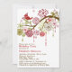Adorable illustration of a cute birds with hat and scarf perched on a whimsical tree with red and green flowers, snowflakes and other design details.