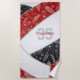 This boho style volleyball themed beach towel for her features the realistic image of an abstractly oversized volleyball that has red, black and white panels - a continuous doodle pattern of paisleys, flowers and feathers in white covers the volleyball's red and black panels - personalise with the athlete's name and monogram, varsity letter or jersey number - by katz_d_zynes
