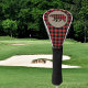 The background on this unique golf head cover is a red and black buffalo plaid pattern. At the centre is a tan circle banner with a matching red and black plaid silhouette bear. Perfect for the golfer who is also a hunter, or just enjoys wildlife.