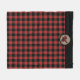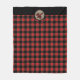 The background on this lumberjack style fleece blanket is a red and black buffalo plaid pattern. At the top centre is a tan circle banner with a matching red and black plaid moose head image, placed on a black top border. Be sure to see the matching home decor products in our store.