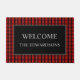 Modern red black buffalo plaid pattern, black frame, family name Welcome script.