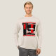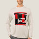 Featured is a complex, geometric design in vivid red and black shapes and lines. The abstract design is a contemporary version of the Mid-Century Modern style and a striking look. Pictured here on an "oatmeal" long-sleeved Tri-blend t-shirt in Classic Printing, with other colours and styles available.