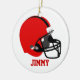Round ceramic ornament with graphics of a red and black football helmet, on the front and a solid red, on the back. Red text, on the front has a name and black text on the back reads Christmas 2012. All text is customisable so that you can personalise for yourself or as a great gift idea to that special football player on your list. Nice has a door hanger or over head fan pull.