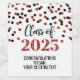 Graduation party custom wine bottle labels class of 2025 with red and black glitter pattern confetti.