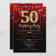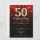 50th birthday party invitation. Elegant red black design with faux glitter gold. Features stylish diamonds, bokeh lights and script font. Men or women bday invite. Perfect for a stylish adult birthday party. Personalise with your own details. Message me if you need further customisation. Printed Zazzle invitations or instant download digital printable template.