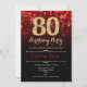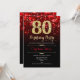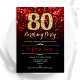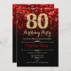 80th birthday party invitation. Elegant red black design with faux glitter gold. Features stylish diamonds, bokeh lights and script font. Men or women bday invite. Perfect for a stylish adult birthday party. Personalise with your own details. Message me if you need further customisation. Printed Zazzle invitations or instant download digital printable template.