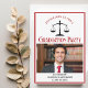 This classic red and black custom law school graduation party invitation features classy typography for a class of 2025 graduate above your student photo. Customise with your graduating year under the scales of justice and photograph for a great personalised lawyer or attorney invite.