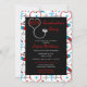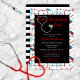 Modern nursing or other medical profession graduation invitation design in red, aqua, black and white featuring a medical collage background on front with a heart shaped stethoscope, bandages, caduceus, EKG, shot needles, thermometers and pills by Holiday Hearts Designs (all rights reserved). Back features a simple black and white striped background (black colour can be changed in "customisation" mode).