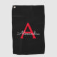 Black and Red Monogram Name Golf Towel. This makes the perfect sweet 16 birthday, wedding, bridal shower, anniversary, baby shower or bachelorette party gift for someone that loves glam luxury and chic styles.