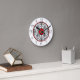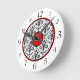Elegant wall clock with a black & white damask pattern accented with red. The numbers are in a fancy size varying pattern to break up the typically uniformity that most clocks display.