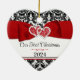 This personalised and romantic heart shaped "Our First Christmas" ornament has a black and white damask pattern at the top and bottom with a red ribbon and bow image with joined hearts images across the top. Below the ribbon, the words, "Our First Christmas" are printed in black with the year below in black script on one side with the names of the happy couple and the wedding date printed on the other with decorative red scrolls between the two lines on each side. If you need any other matching items, please email niteowlstudio@gmail.com and watch your spam/junk folders for my reply, or use the Zazzle chat feature to contact me.