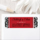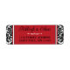 These black and white damask pattern wedding return address labels have a damask pattern on the left and right sides with the text area in red with black and white edges in the centre that match the wedding invitation set below. Your name(s) and return address are in black with an ornate white scroll divider between them.