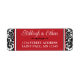 These black and white damask pattern wedding return address labels have a damask pattern on the left and right sides with the text area in red with black and white edges in the centre that match the wedding invitation set below. Your name(s) and return address are in white with an ornate black scroll divider between them.