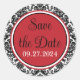 This round black and white damask pattern wedding envelope seal has a central red round shape with edges in black and white. The words, "Save the Date" are printed in black with the wedding date below in white. If you need any additional matching items, please email your request to niteowlstudio@gmail.com or use the Zazzle chat feature to get in touch.