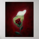 A striking red flower emerging through a soft abstract opening, revealing a calm green landscape beyond.