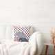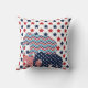 A cute and colourful throw pillow featuring three elephants in polka dots, chevron stripes, and diagonal stripes of white, blue, and red on a white with blue and red stars background.