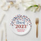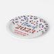 Customisable graduation party class of 2023 plates in glamourous blue and red confetti pattern and elegant hand lettered style text.