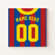 This design is an soccer (football) / rugby / sports style jersey with yellow buttoned collar, and red and blue stripes, you can also add your own logo or text to the front, just click on 'CUSTOMIZE'.