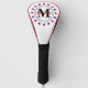 This golf driver cover features your monogram in black within a circle framed with black dots and double black lines. On the outside of the black frame is a circle of alternating red and blue stars. Your name is written in red over the centre monogram. Classy!