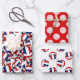 Fun wrapping paper sheets for volleyball players or fans with three unique patterns, one sheet featuring a 3D look pattern of volleyballs that have red, white and blue panels - sheet 2 has simple white volleyballs on customisable red - sheet 3 has a simple pattern of red, white and blue volleyballs on customisable white - by katz_d_zynes