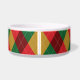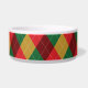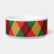 Colourful and festive argyle pattern in red, green and yellow colour scheme. There is also a red dog bone shape that has a personalizable text area for pet's name on top of it.
