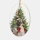 On the front of this Holiday ornament is the image of an adorable little Pug Dog wearing a festive red bow. The dog sits in front of a decorated Holiday tree. On the back, red and green text says MERRY CHRISTMAS", and there are additional text fields for you to customise. Make it say whatever you'd like!