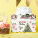 The repeated pattern on this Christmas wrapping paper includes an image of a cute Beagle dog wearing a festive red bow. The dog sits in front of a decorated Holiday tree. Stylised red and green text says MERRY CHRISTMAS", and your own signature is in two fields for you to customise. Other images included in the pattern include red decorative snowflakes, candy canes, and a peppermint lolly pop.