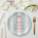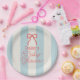This coquette baby shower paper plate features a red bow on a cream background with light blue stripes. Personalize it for your needs. You can find matching products at my store.