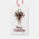 Convey the true meaning of Christmas with this beautiful gift tag featuring a wooden cross decorated with a blood red bow and evergreen bough. Matching red script text at the bottom says "Merry Christmas". The same image is on the other side, with a custom text field.