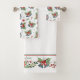 Here's a pretty Holiday season bath towel set that features silver bells and holly sprigs tied with a bright red bow. Along with the bell images are red poinsettia blossoms, pine cones, red berries and blue snowflakes. The pattern is placed on a snow white background, and covers the hand towel and the wash cloth. The bath towel is white, with a matching silver bell, red bow, holly and red berry border, plus your name in matching green script. Elegant and beautiful!