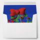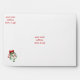 A red bow with ribbon streaming down over a branch of green holly, leaves and red berries. The inside of the flap is designed on a blue backround. Merry Christmas is printed in red on the back top flap of the envelope. Customise with your own words. This envelope matches the card and stamp "Red Bow & Holly".