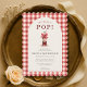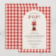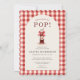Charming Shes Ready to Pop baby shower invitation featuring a red bow and classic gingham design. Perfect for a fun and festive baby shower with a playful pop theme and cozy country style. Ideal for celebrating with family and friends in a cheerful, coordinated setting. Editable text. Print ready layout.