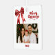 A white background, red text and a red bow. Text and photo. Merry Christmas is written with a retro style font.