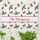 Destei's original festive pattern of green and red Christmas Holly / Common Holly plants together with red bows. There is also a personalizable text area for a family name or other custom text.