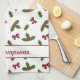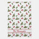 Red Bows And Christmas Holly Plants Pattern & Text Tea Towel