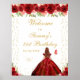 This elegant and glamourous birthday party welcome sign features a beautiful princess with brown red hair and fair skin in a red ball gown. The text combines handwritten script and modern sans serif fonts for a classy and sophisticated look. The floral arrangements, butterflies and gold confetti create the perfect blend of rustic and chic.