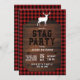 Rustic stag party invitation with the white silhouette of a stag, red buffalo check, and wood grain. Red buffalo check stag party invitation with cool fonts and printed wood grain. Wood grain stag party invite with a white deer and a red and black plaid background.