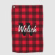 Red buffalo plaid custom monogram golf towel gift. Personalised present for him or her. Monogrammed golfing gifts for men and women. Custom Birthday gift ideas for golfer, husband, wife, mum, dad, father, friend, co worker, boss, colleague, sports coach, instructor, trainer, teacher, grandpa, retired person, golf lover etc. Including hook to hang it up. Unique golf accessories for friends and family. Black and red lumberjack pattern. Chequered flanel design. Change into any colour.