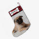 Modern Christmas stocking features a personalised design for your pet dog with custom monogram name text in black on a white coloured bone nameplate. A red and black buffalo plaid pattern accents the design, and your furbaby is featured in a large photo space. Includes a monogram and photo design on both sides of the stocking.